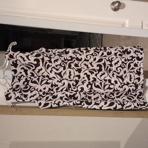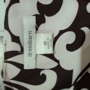Classic sleeveless shift dress in a dark brown and white scroll pattern. Tailored silhouette for a polished, office-to-evening look. Lightweight fabric with clean lines for easy styling. Knee-length