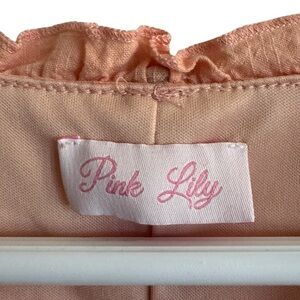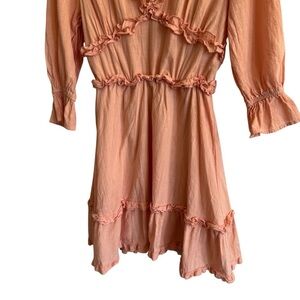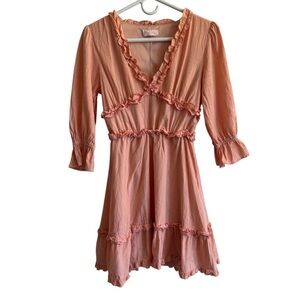 Darling pink open back dress from Pink Lily. This has a ruffled v neckline, 3/4 sleeves flared sleeves, and ruffle detailing throughout. The back has a fun cutout. Size Small and in great preowned condition; no visible flaws.