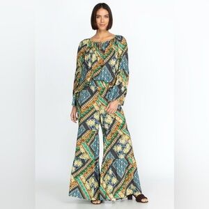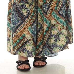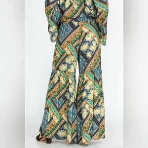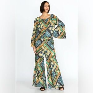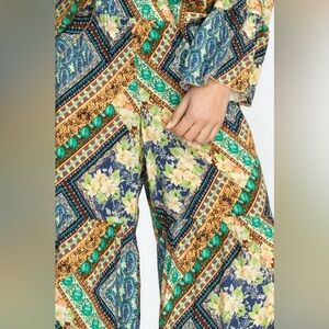 Embrace vibrant style with this floral patchwork jumpsuit. Perfect for any occasion, it features a mix of blue, green, and brown hues. Enjoy comfort and elegance in one stunning piece.