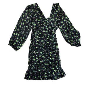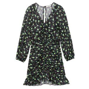 Sandro dress, floral mini dress, ruched dress, black floral dress, long sleeve dress, V-neck dress, multicolor dress, ruffle hem dress, keyhole back dress, evening wear, party dress, 34 size dress, women's designer dress