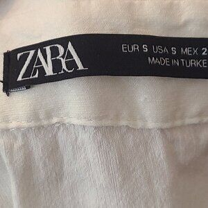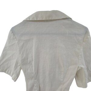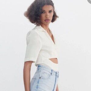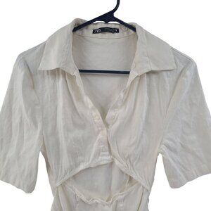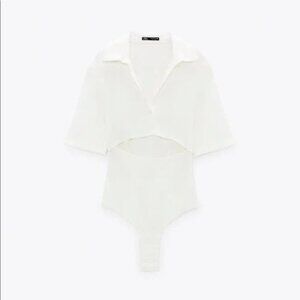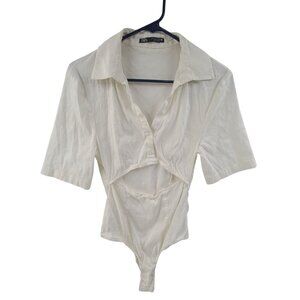 Zara White Elastic Linen Cut out Bodysuit Collard V Neck Short Sleeve Size S