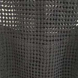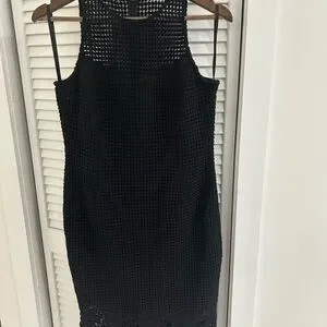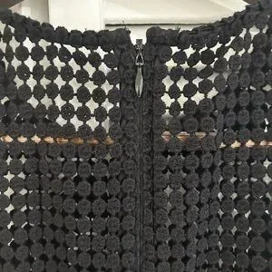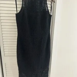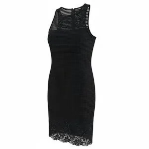 Sleek sleeveless sheath dress in black crochet knit. High neckline with openwork detail. Beautiful lace hem for feminine finish. Streamlined silhouette for polished looks.