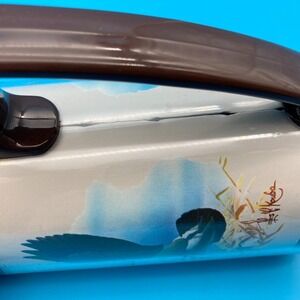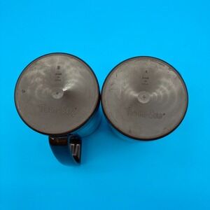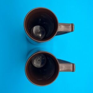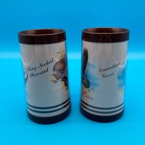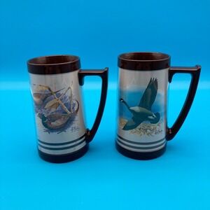 Fair to Good vintage condition. The graphics are bright and clear, but there is a notable crack in the plastic inner liner near the rim of the Canadian Goose mug (see last photo). The pheasant mug appears intact; both show light surface scuffing on the brown plastic bases and handles consistent with age.