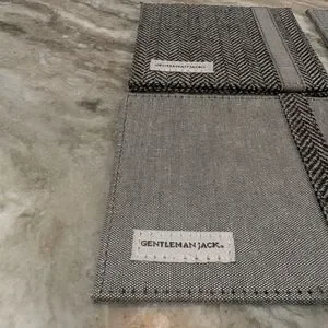 Set of four square fabric coasters. Two feature black-and-cream herringbone. Two are solid gray with herringbone trim. Subtle stitched label reads GENTLEMAN JACK. Stylish neutral tones for any table.