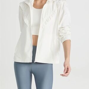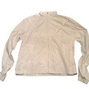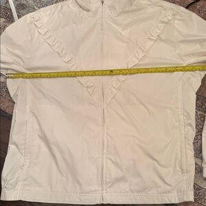 Stylish white jacket with ruffled detailing and a zip-up front. Perfect for a chic look.