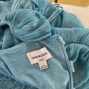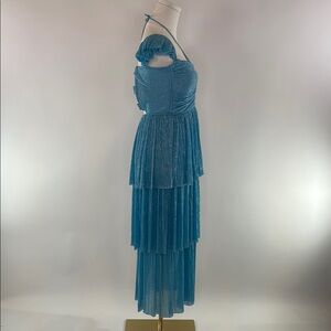 Everything about this Sabina Musayev design is romantic: from the sparkly turquoise chiffon tiered skirt, to the corseted back, halter tie, flutter sleeves and gorgeous key hole cutouts.