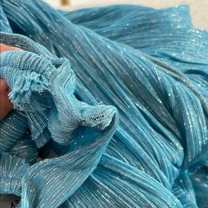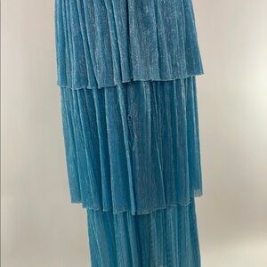 Blue chiffon (100% Polyester). A-line. Cap sleeves. Square neck. Back zipper closure. 52" from shoulder to hemline. Imported.