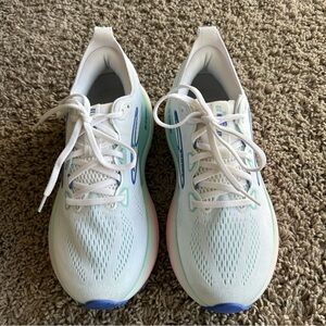 Brooks women's running sneakers in white with blue logo accents and mint trim. Breathable mesh upper for airflow. Cushioned midsole for responsive support. Secure lacing for a stable fit. Subtle pastel detailing for a fresh look.