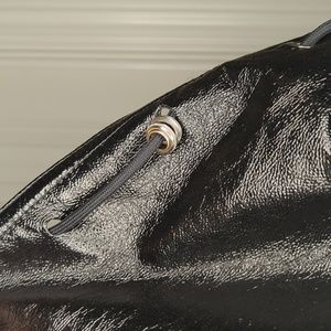 LeSportsac backpack with playful heart print. Shiny black body with multiple exterior pockets. Top flap and side pockets feature red, pink, and white hearts. Adjustable straps and front buckle closure. Lightweight nylon construction. Cute and casual everyday style.