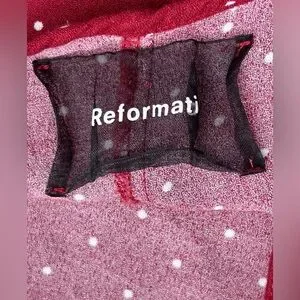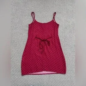Chic red slip dress with white polka dots from high-end brand, Reformation. Perfect for casual outings, and can easily be dress up too. It's got a tie in the back that you can adjust to snatch your waist in perfectly.