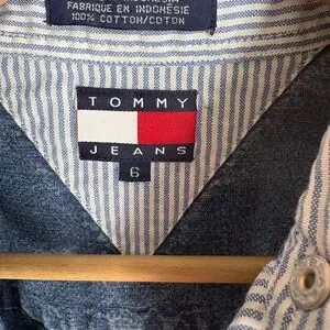 Light blue denim button-up featuring Tommy Jeans logo and flag patch. Contrasting striped inner collar detail. Classic casual wardrobe staple.