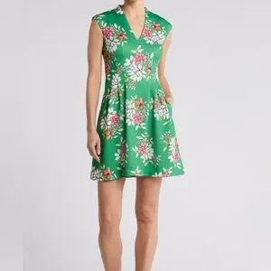 Vince Camuto Green Floral Scuba Knit Fit and Flare Dress Size 8. Vibrant flowers. Princess seams and pleats for a full skirt look. Hidden back zipper. Sleeveless. Hidden side pockets. V-neck. See photos for measurements and fabric content. NWT.