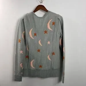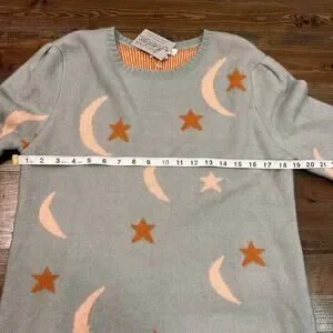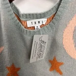 This THML women's crewneck sweater is brand new with tags and ready to add a touch of celestial charm to your wardrobe! Featuring a delightful blue moon and star design, this sweater is perfect for cozy days and stylish nights.