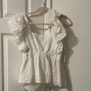 Delicate cream eyelet fabric with feminine ruffle straps. Deep V-neck with button-front detail. Defined peplum waist for a soft silhouette. Lightweight and romantic for warm-weather outfits.