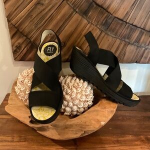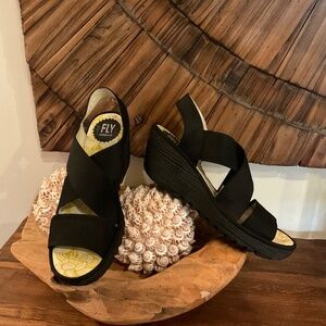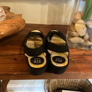 Fly London YAJI 888FLY Cupido Leather Wedge Sandals, Color Black, Size 38, Gently Pre owned, in very good condition .