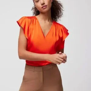 Vibrant orange blouse with flutter sleeves. Elegant V-neck design. Perfect for any occasion. NWOT, color is Flame
