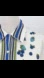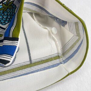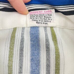 + Notable Details: Pointed collar, button-up front, textured fabric, geometric striped novelty fruit print featuring cherries, strawberries, and berries in blue and green.