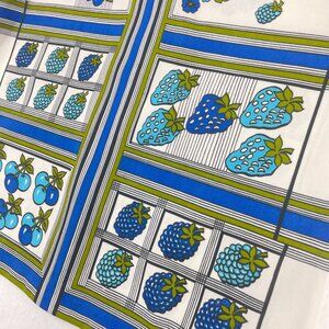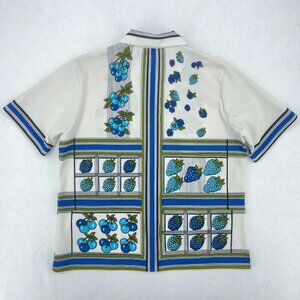 Vintage 70s Novelty Fruit Print Button Up Shirt Blue Cherries Kitsch Womens L XL