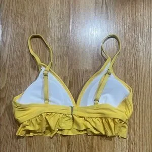 Bright yellow two-piece bikini with delicate ruffle trim. Padded top with adjustable straps. Classic bikini bottom with matching ruffle detail. Vibrant summer color.
