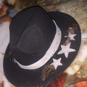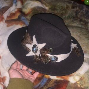 Stand out at the local rodeo or concerts with this stylish black felt fedora with hand-cut real cowhide accents. Features a decorative cowhide band with feather accents and turquoise concho details. Soft felt construction delivers a comfortable fit and elevated look. Perfect for adding a touch of western flair to any outfit. 🐎