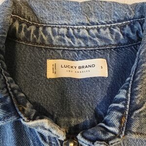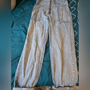 Stylish denim jumpsuit. Features front zipper and tie waist. Long sleeves with button cuffs. Perfect for casual wear.