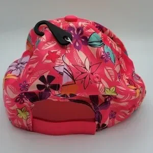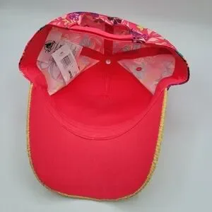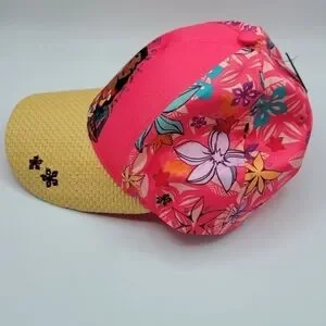 The peak of this cap is a fun basket-weave effect, and the side and back panels to the hat are covered in colorful, tropical flowers.