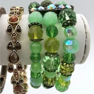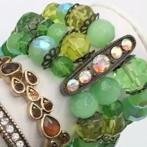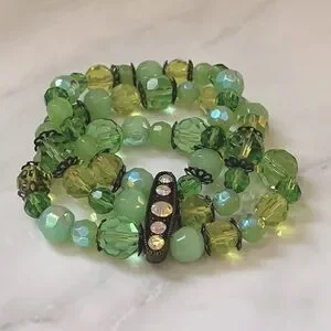 A gorgeous triple strand statement stretch bracelet thatβll add a pop of color and glamour to your look. Wear on its own or stack with other pieces in your collection. Faceted glass and acrylic stones in beautiful shades of green.