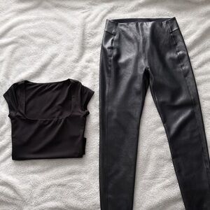 Stylish 2-piece bundle featuring sleek black faux leather pants paired with a soft satin top—perfect for a night out, date night, or elevated casual look.