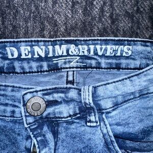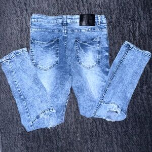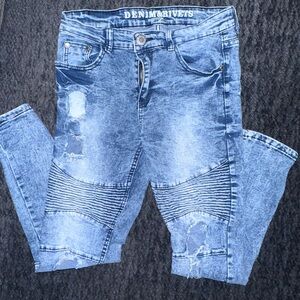 Stylish distressed blue jeans with ribbed detailing. Perfect for casual wear.