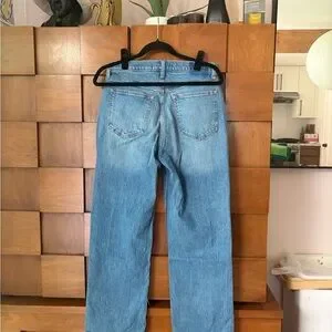 Straight-leg men's jeans in a light blue wash. Classic five-pocket styling with subtle whiskering. Clean hem and relaxed fit through the leg. Simple, versatile denim for everyday wear.