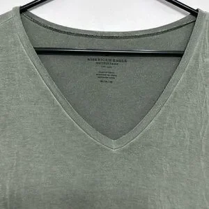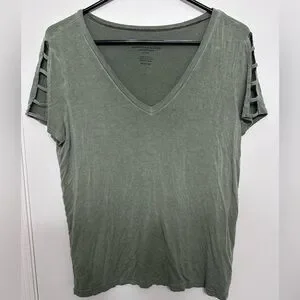 American Eagle Outfitters olive green V-neck top with stylish ladder cut-out short sleeves. Soft, lightweight fabric for everyday comfort. Versatile design pairs well with jeans or skirts.