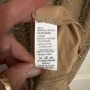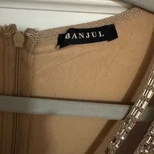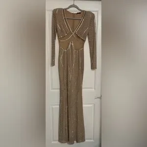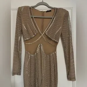 Chic tan dress with sparkling silver details. Long sleeves and stylish design.