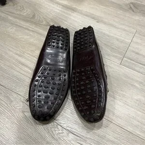 Glossy brown patent leather driving moccasins. Metallic silver bow and insole accents. Slip-on style with rubber pebble sole. Elegant, city-ready look. Size 36 equivalent to 6.5 US. Fair condition offers welcome