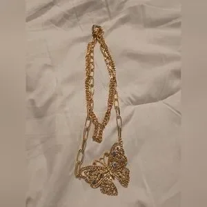 Paparazzi gold-tone butterfly pendant necklace. Features sparkling aurora crystal accents for luminous color play. Delicate filigree detail creates elegant texture. Versatile statement piece for dressy or casual looks.