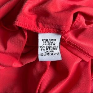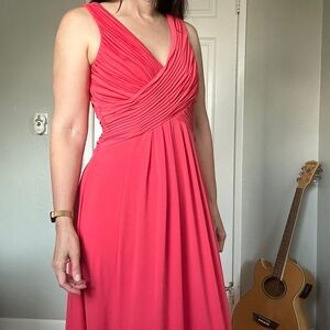The perfect wedding guest dress, quinceañera, dressy party dress, Size 6. So comfortable. Machine washable and packable. Fabric has bounce and stretch and doesn’t wrinkle. Color is a vibrant pink coral color. Flattering cut, perfect for party going when you want to eat, drink and be merry! Top of shoulder to hem is 57”.