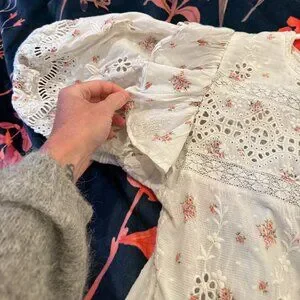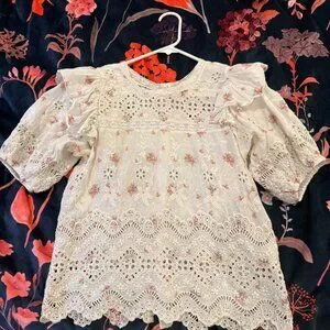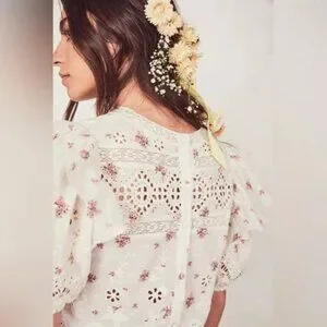 The Tilda Top is ornate in cotton eyelet with a sweet rose print and broderie anglaise details: On either side of the trimmed crewneck collar, flounces collapse from the shoulders over puffed sleeves with encased elastic openings. Embroidery and lace patterns snake across the roomy bodice and sleeves, creating a repeated scalloped motif. Shown here in French Cream.