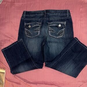 Dark blue wash women's jean capris with decorative back pocket stitching. Comfortable mid-rise fit and versatile style. Pairs easily with casual or dressed-up looks. Includes dark blue color and stylish pocket detail. Size 12 Excellent condition