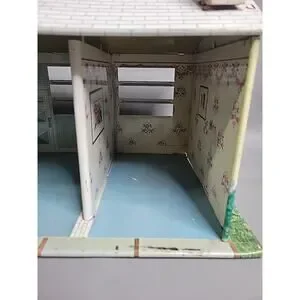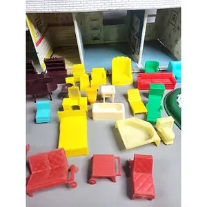 Vintage T Cohn tin 2 story doll house w/ lots of furniture and a pool! Doll house has some rusting/scratches and some of the tabs are broke off. Furniture is mostly in good condition, but does have some issues w/ a couple a pieces w/ broke off legs.