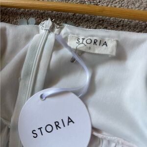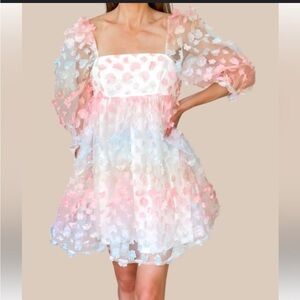 Elegant dress with pink and blue floral accents. 3D flowers, Ideal for formal events.