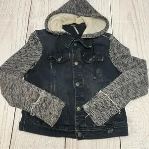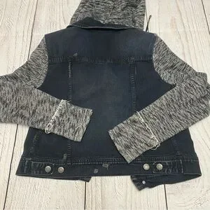 Layered look jacket with a dark blue/black denim body and knit gray hood and sleeves. Button-front closure with chest flap pockets. Casual and cozy style for everyday wear.