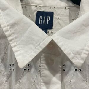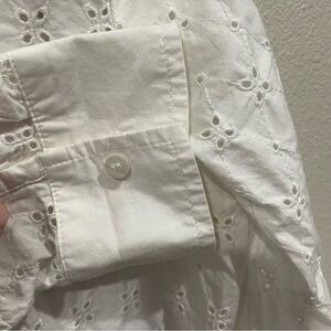 Features intricate all over embroidered eyelet pattern often referred to as relaxed eyelet lace boyfriend fit.