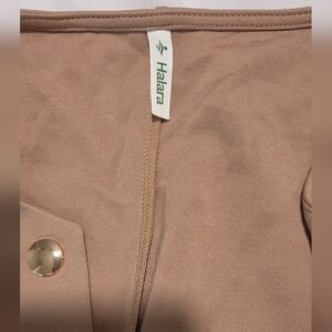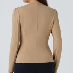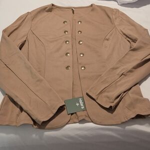Tailored taupe blazer with military-inspired double row gold buttons. Structured seams create a polished fit. Lightweight and versatile for layering. Clean, minimalist collarless design.