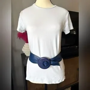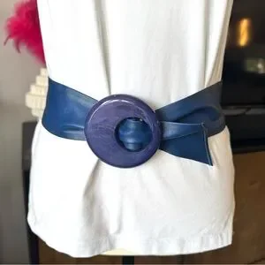 Fun and totally 80s! This vintage navy blue leather belt features a bold round acrylic buckle with a marbleized color design for that perfect retro flair. The belt adjusts by looping through the holes in the buckle, making it both stylish and functional.