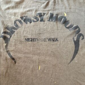 Features an intentionally faded, washed brown/khaki green color and a black arched graphic that reads "DROWSY MOODS" and "NIGHTMARE WALK." The shirt has a trendy oversized, boxy fit that's super comfortable. Made from 100% cotton