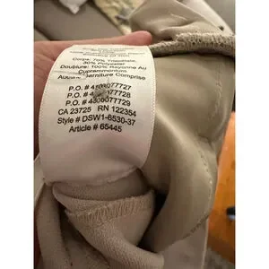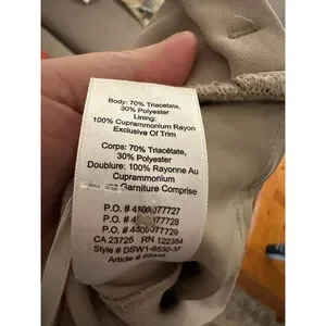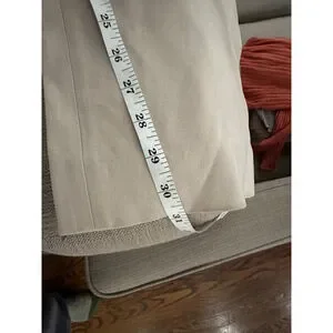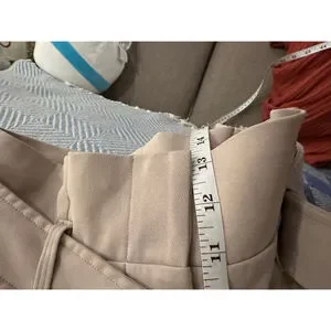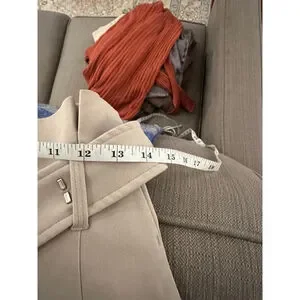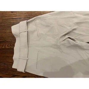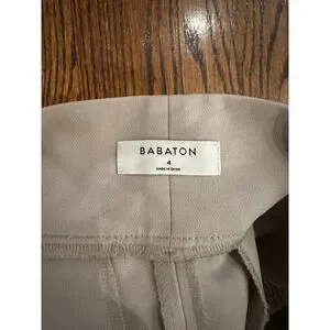 These are pre-owned Babaton women's wide-leg pants in a beige color, size 4. The pants feature a high-waisted design with a wide, integrated belt that has a hook-and-loop closure. They are made from a blend of 70% triacetate and 30% polyester, with a 100% cupro lining. The pants have front pockets and two faux back pockets. Measurements indicate an approximate waist of 13.5 inches and an inseam of about 30 inches. There are no significant visible imperfections.