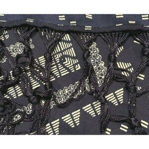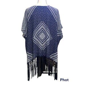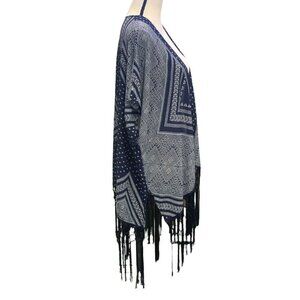 This Maurices women's kimono-style cardigan is the perfect addition to any casual or workwear outfit. The collarless design and fringe bottom add a touch of boho-chic to the geometric patterned piece. The mid-length coat, made of polyester, is easy to care for with hand washing only. The blue and white color scheme is perfect for any season, whether it be winter, summer, fall, or spring. The regular fit and S/M size make it a comfortable choice for any occasion, whether it be for business or personal use. This Maurices kimono is a trendy and stylish choice for any woman's wardrobe.
