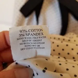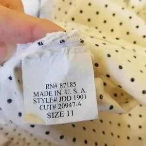 A-line silhouette. Ivory fabric with small black polka dots. Black waist sash tied into a bow. Subtle scalloped trim at the neckline. Flared skirt for a classic feminine look.