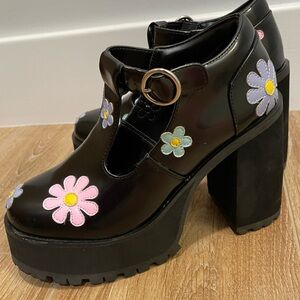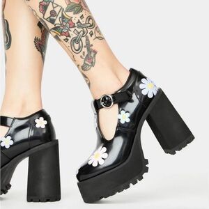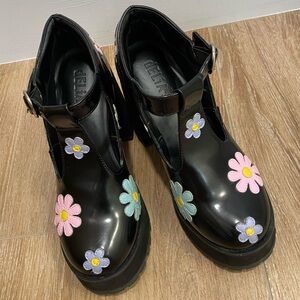 cuz you're as pretty as a flower, bb. You got 'em all in a tizzy when you wear these chunky platform mary janes that have sweet lil daisies all over, treaded soles, and an adjustable buckle closure around the ankles