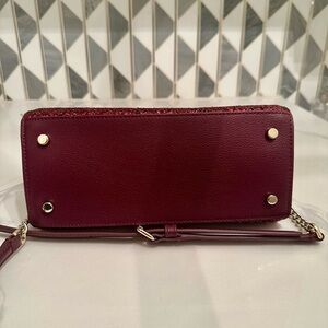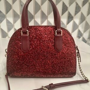Kate Spade New York red glitter dome satchel with removable and adjustable crossbody strap. This structured handbag features a beautiful sparkling glitter exterior with burgundy leather trim and gold-tone hardware.