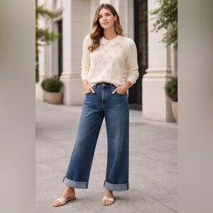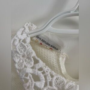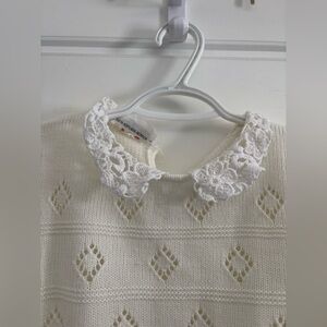 Crafted in a delicate textured knit with subtle diamond patterning, this piece is elevated by its standout detail: a beautiful scalloped lace collar that gives it a soft, heirloom-inspired look. Slightly puffed shoulders add just the right amount of structure, making it feel special without being overdone.